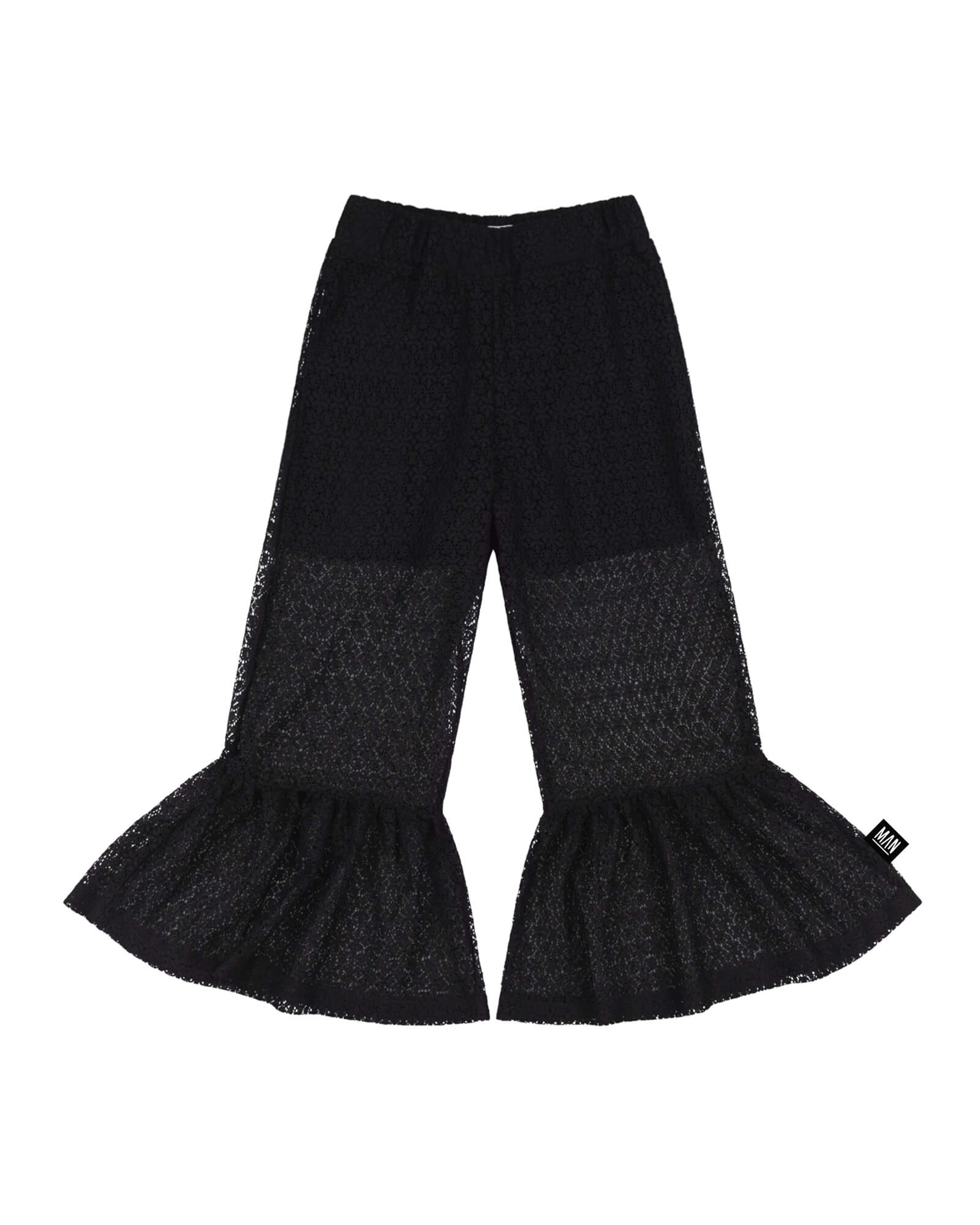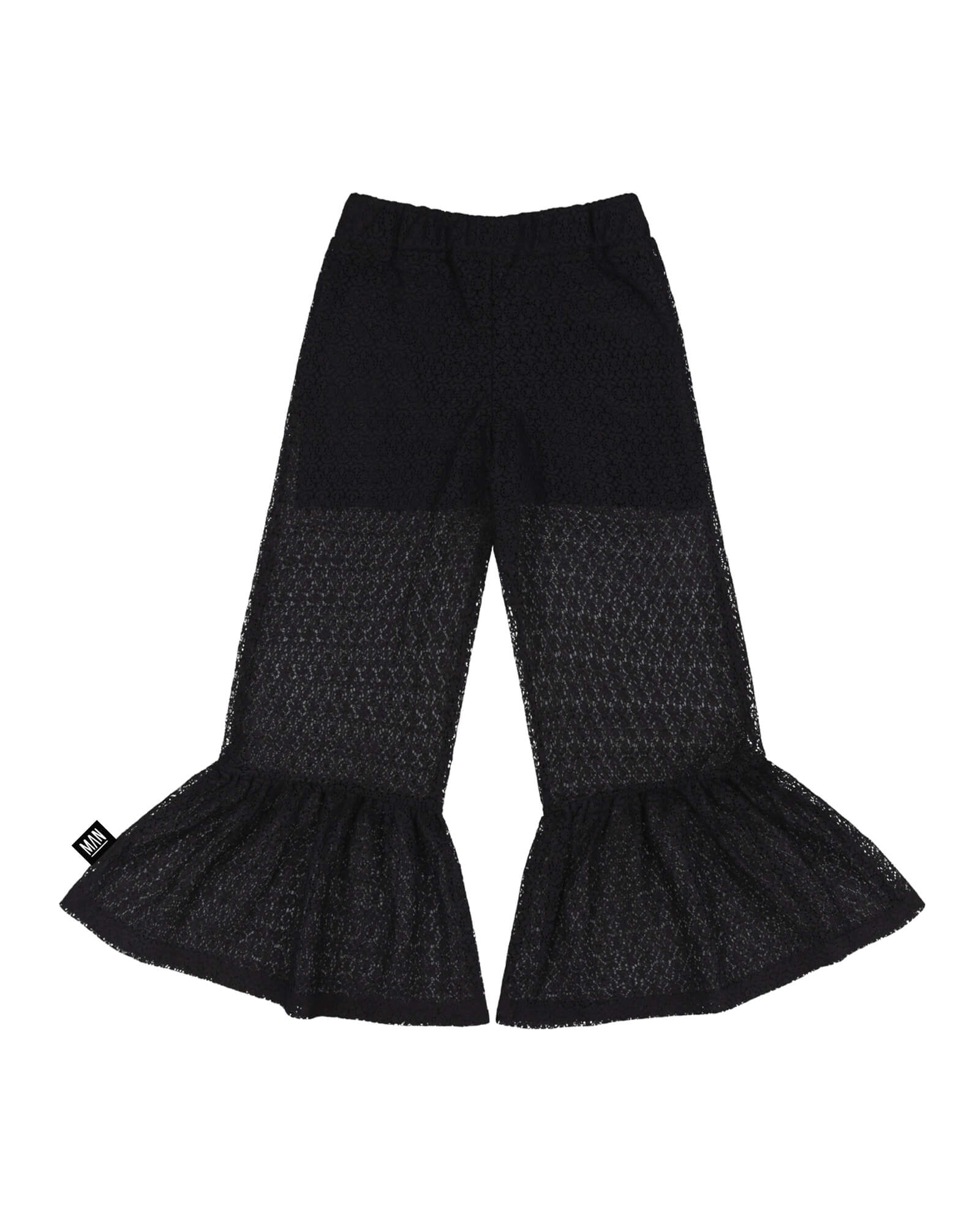 The black lace kids pants combine dramatic movement with modern streetwear attitude. Crafted from lightweight sheer lace, they feature a fitted upper leg and flared ruffle hem for a bold, expressive silhouette.