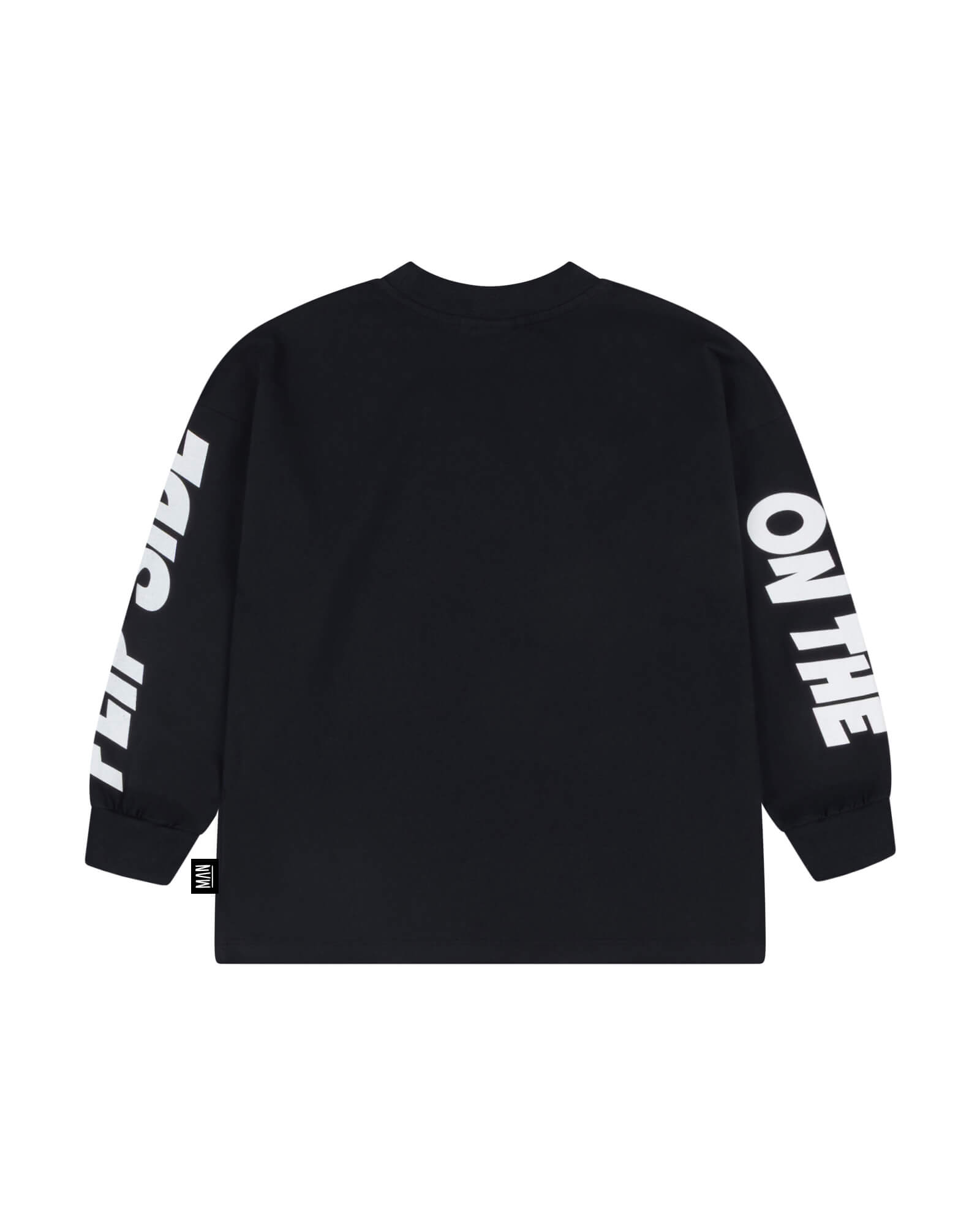 Black organic kids longsleeve in soft cotton jersey with bold sleeve graphics and relaxed street-inspired fit.