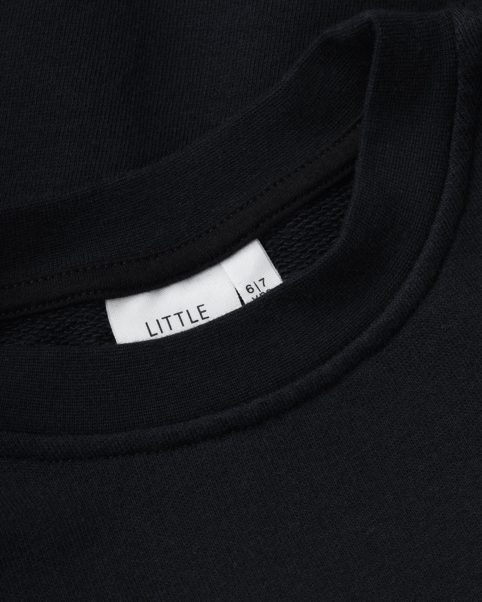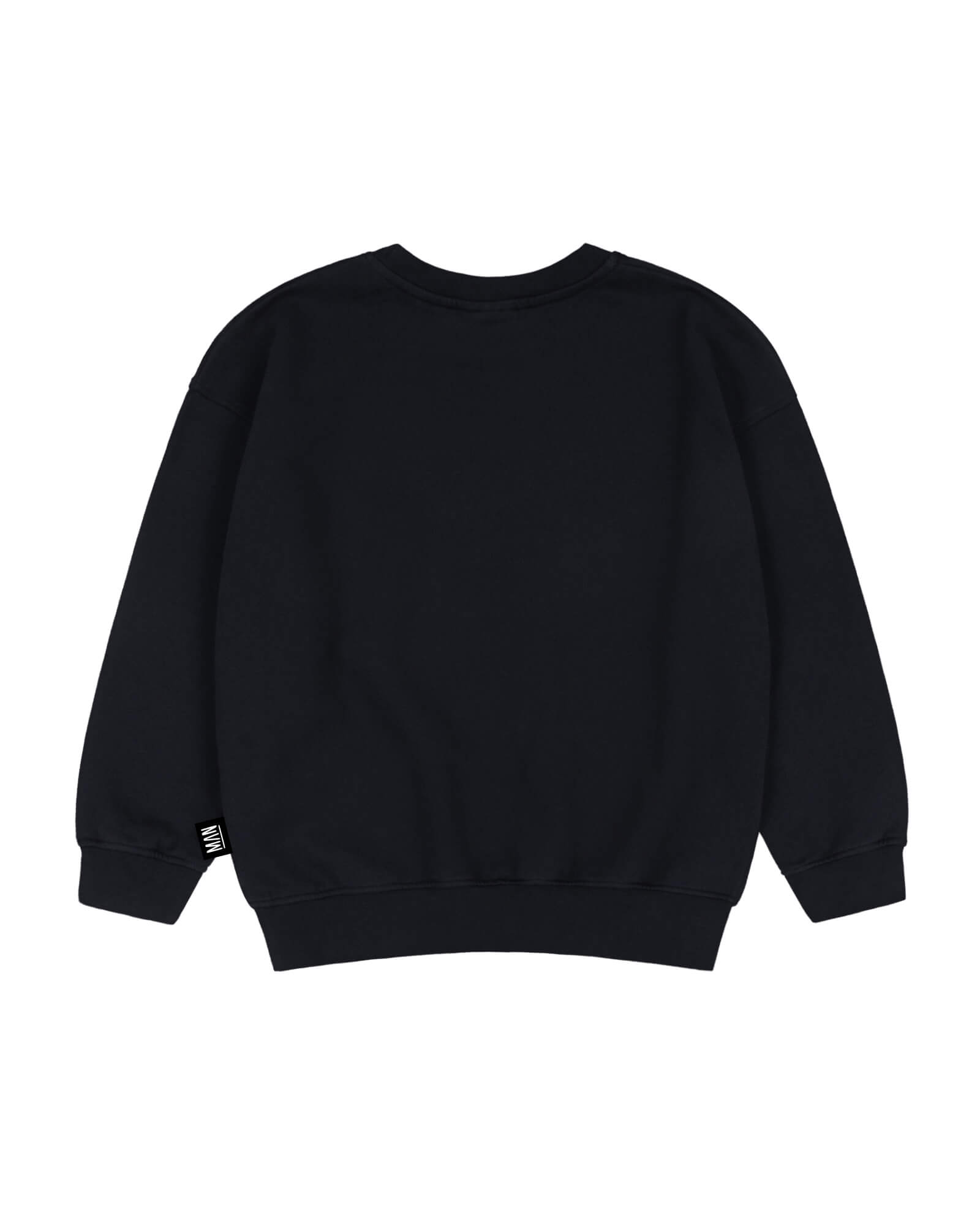 The BOOM Sweatshirt in black is made to stand out. Crafted from 100% organic cotton American fleece, this black organic kids sweatshirt combines a smooth outer surface with a soft loopback interior for breathable warmth and lasting structure.