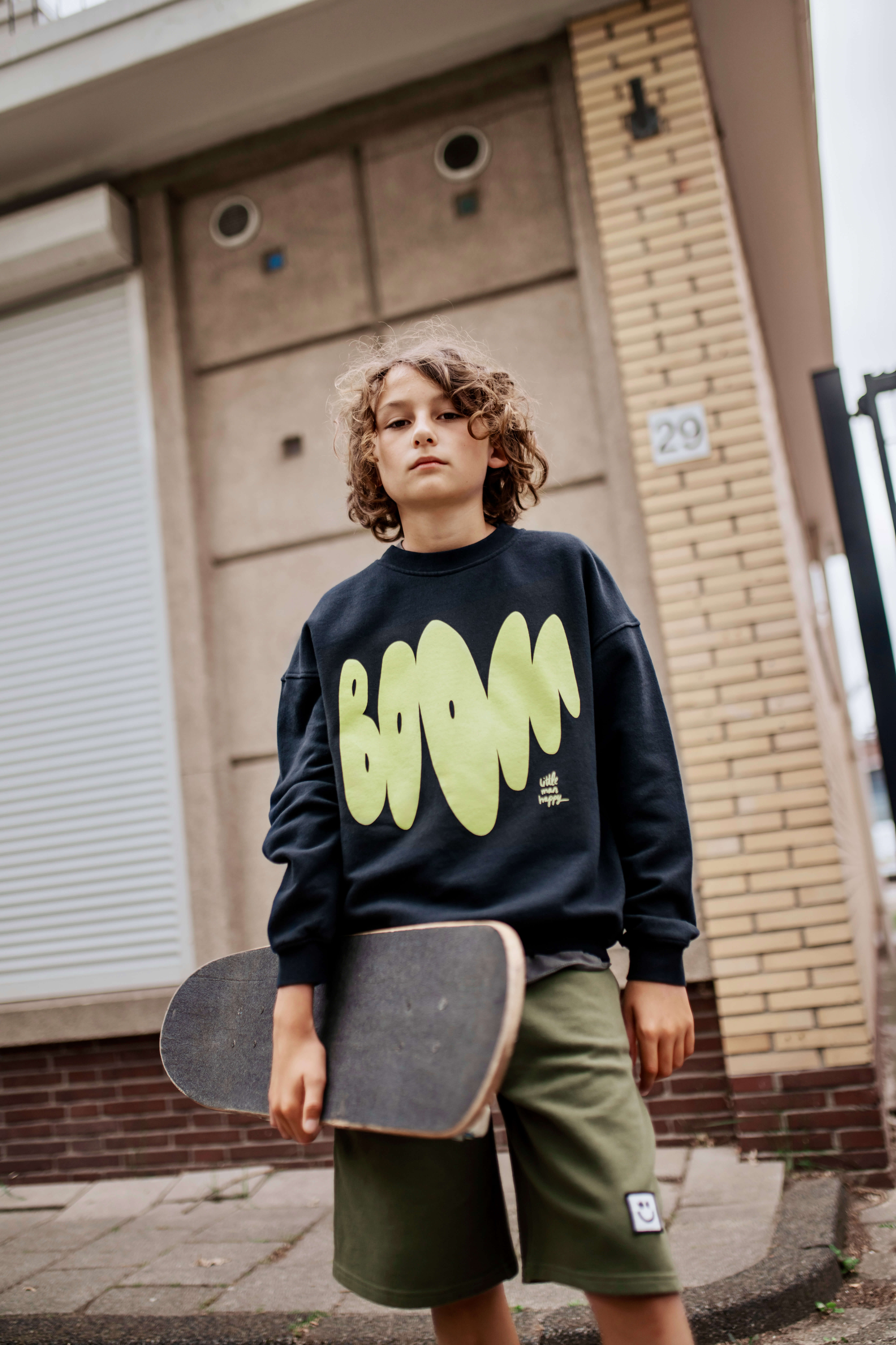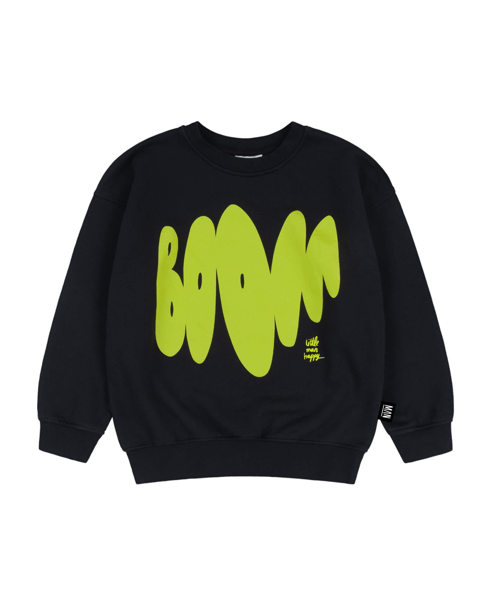 Black organic kids sweatshirt in premium American fleece with oversized neon BOOM placement print and soft loopback interior. The relaxed street-inspired silhouette, ribbed trims and structured heavyweight feel combine bold graphic impact with everyday comfort and long-lasting organic quality.