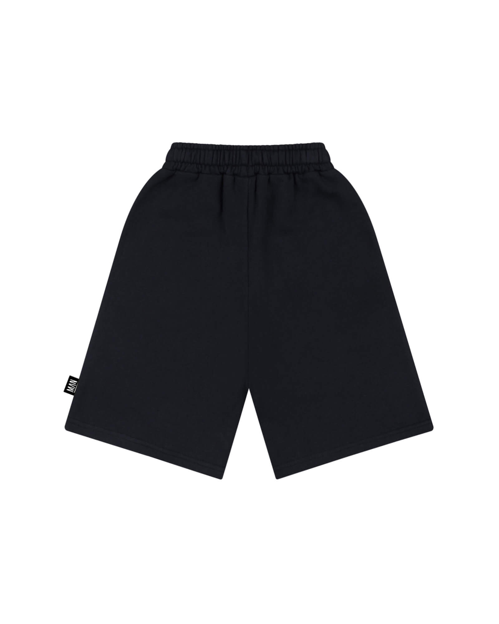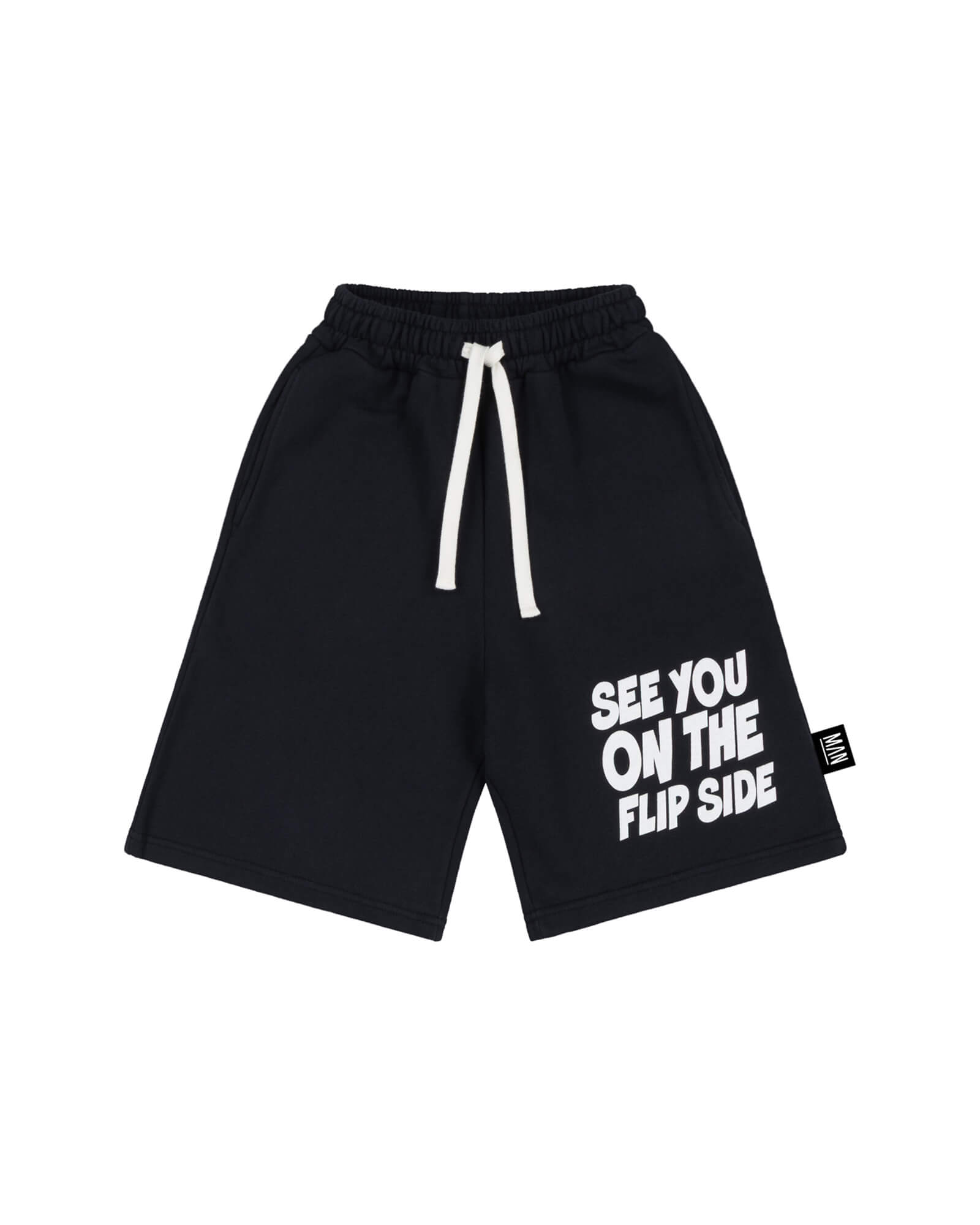 Black street long shorts in organic cotton American fleece with bold FLIPSIDE typography print and white flat drawstring. Relaxed silhouette with statement attitude.