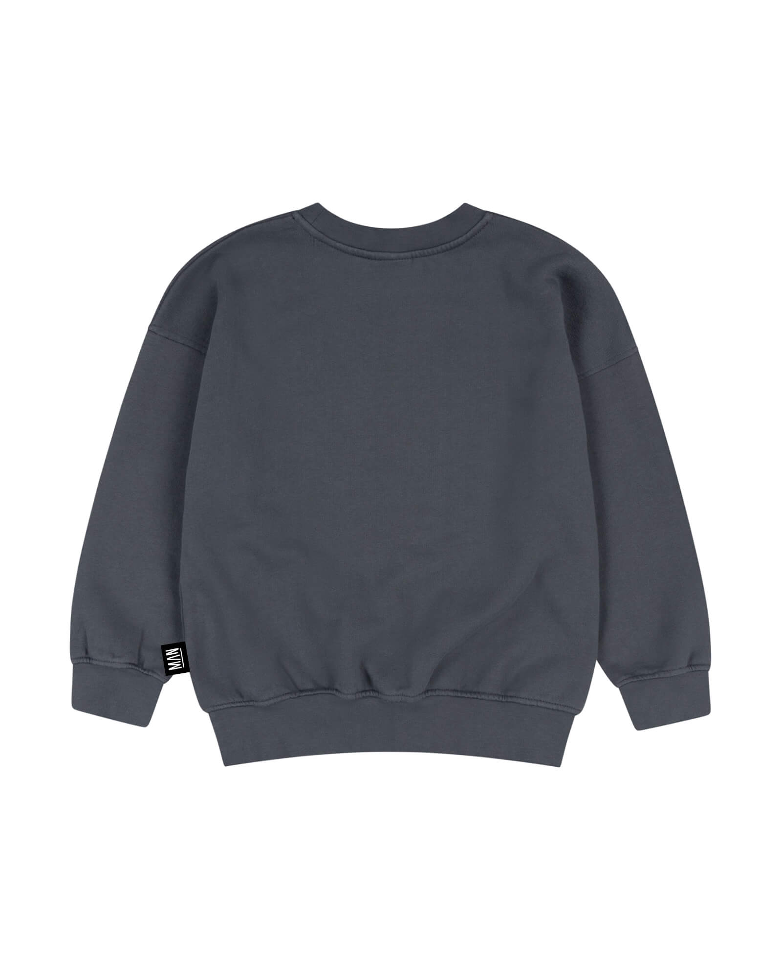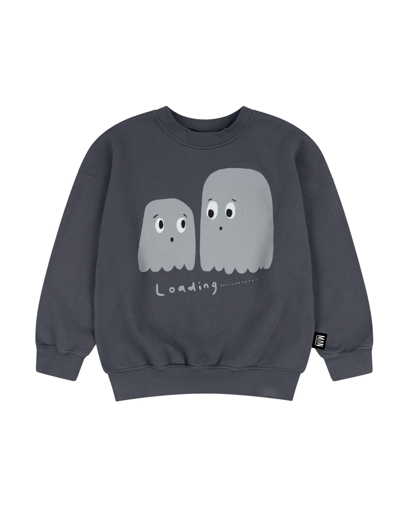 Dark grey kids sweater in organic cotton American fleece with LOADING BOO artwork. Soft loopback interior and relaxed street-ready silhouette.