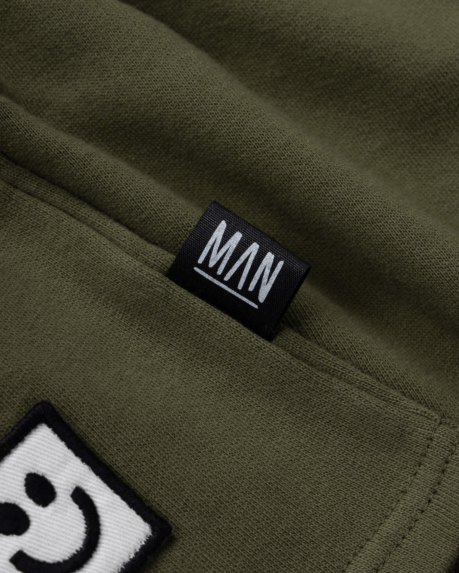 The muted mud green tone brings a grounded, modern feel — easy to style, seasonless and understated. A small woven LMH smiley patch adds subtle identity without overpowering the minimalist look.