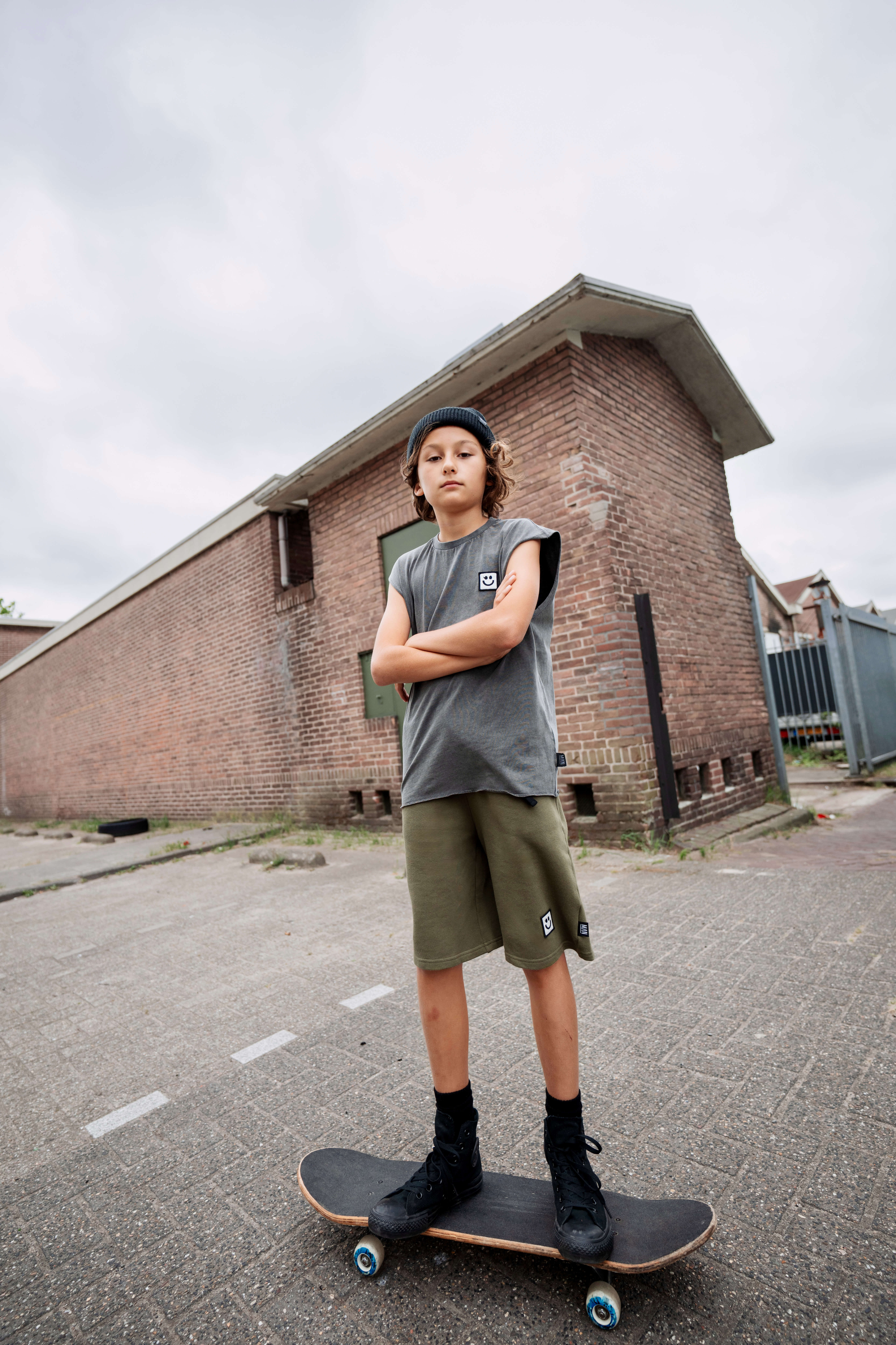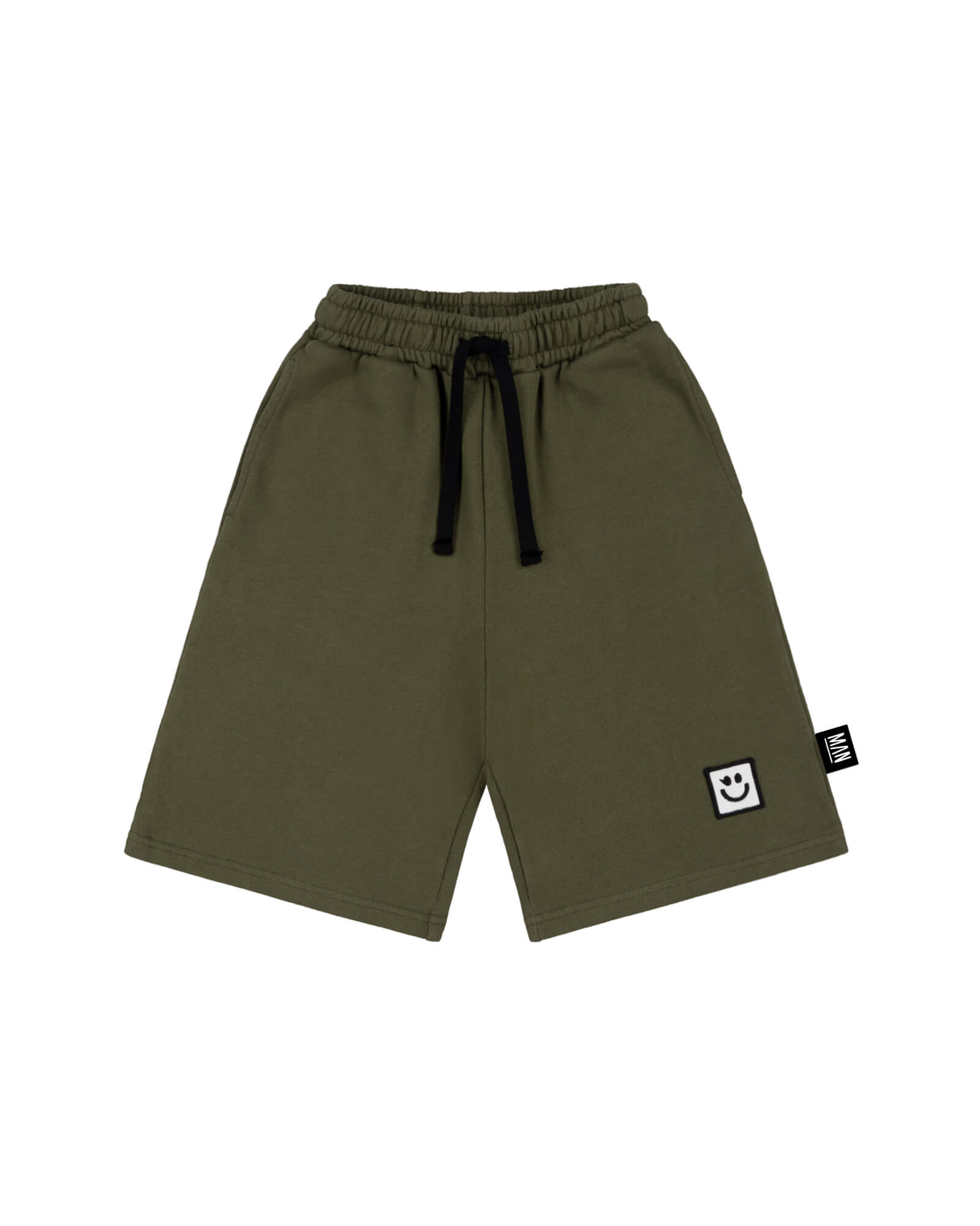 Green kids long shorts in organic cotton American fleece with soft loopback interior, elastic waistband and subtle LMH smiley patch detail. Relaxed longline fit for everyday movement.