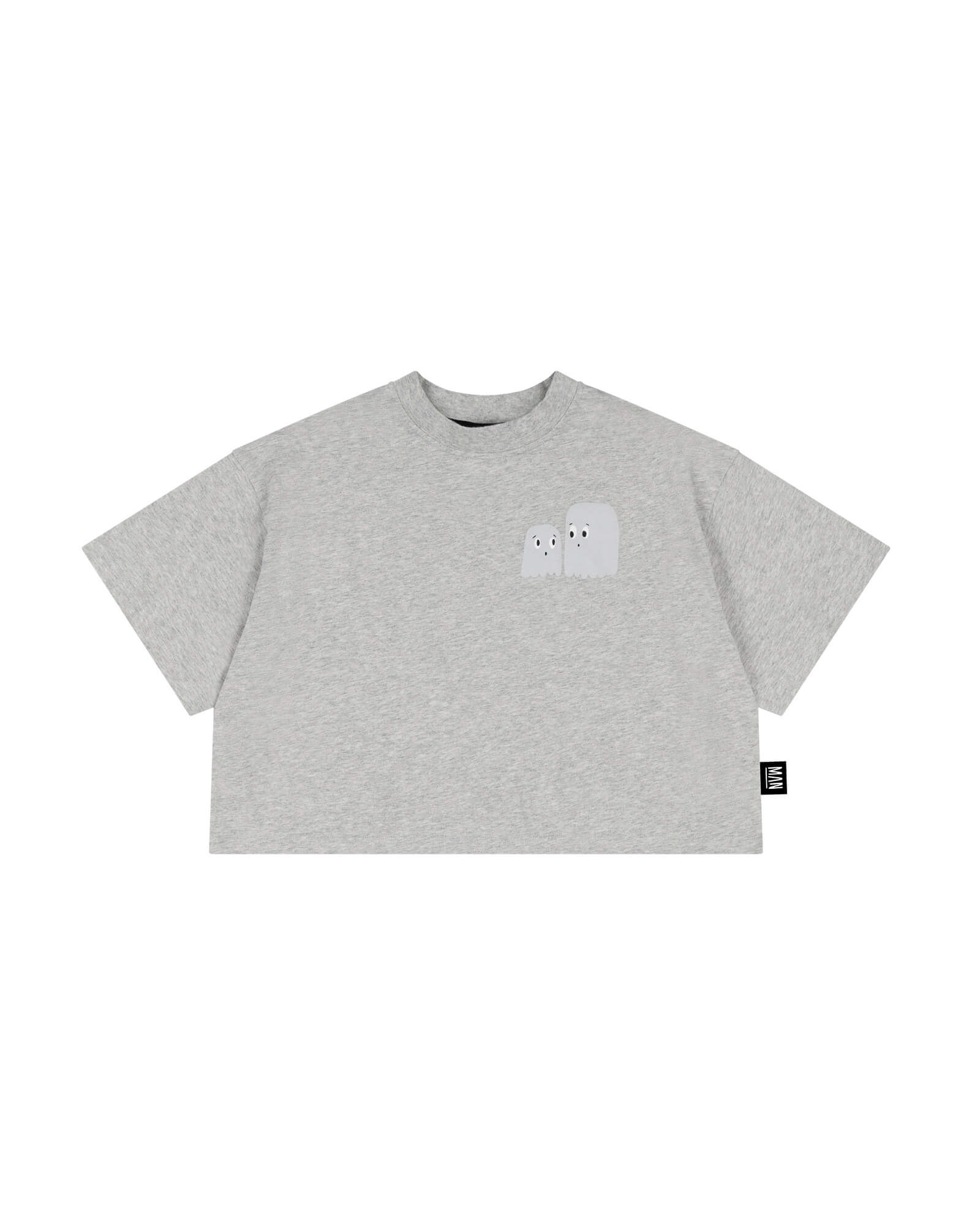 The MINI BOO Boxy T-Shirt in grey melange combines modern proportions with subtle character detail. Crafted from soft organic cotton jersey, this grey boxy kids t-shirt offers breathable comfort with a structured, contemporary silhouette.