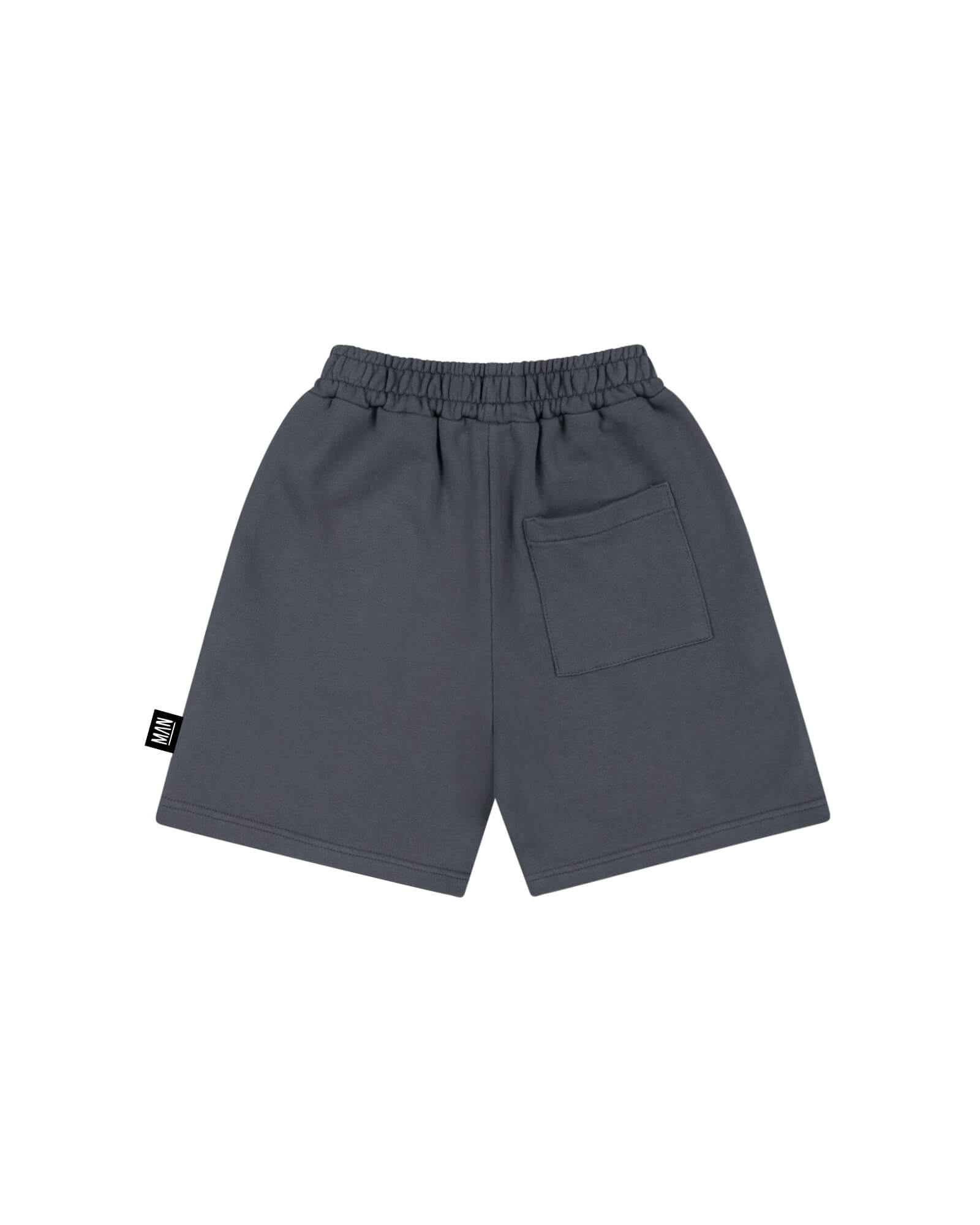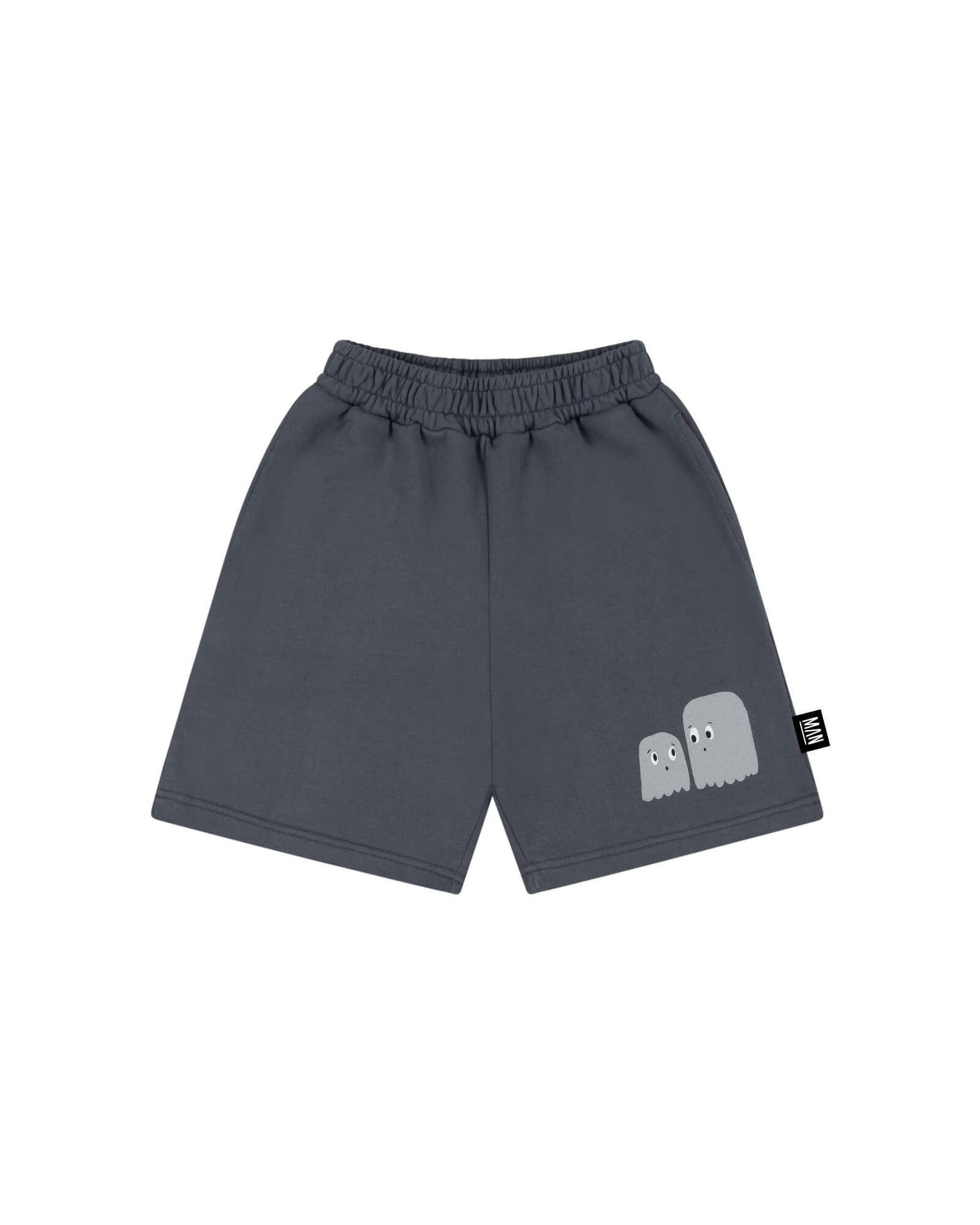The MINI BOO Skate Shorts in dark grey deliver understated graphic character with everyday functionality. Crafted from 100% organic cotton American fleece, these grey kids skate shorts combine a structured outer surface with a soft loopback interior for breathable comfort.