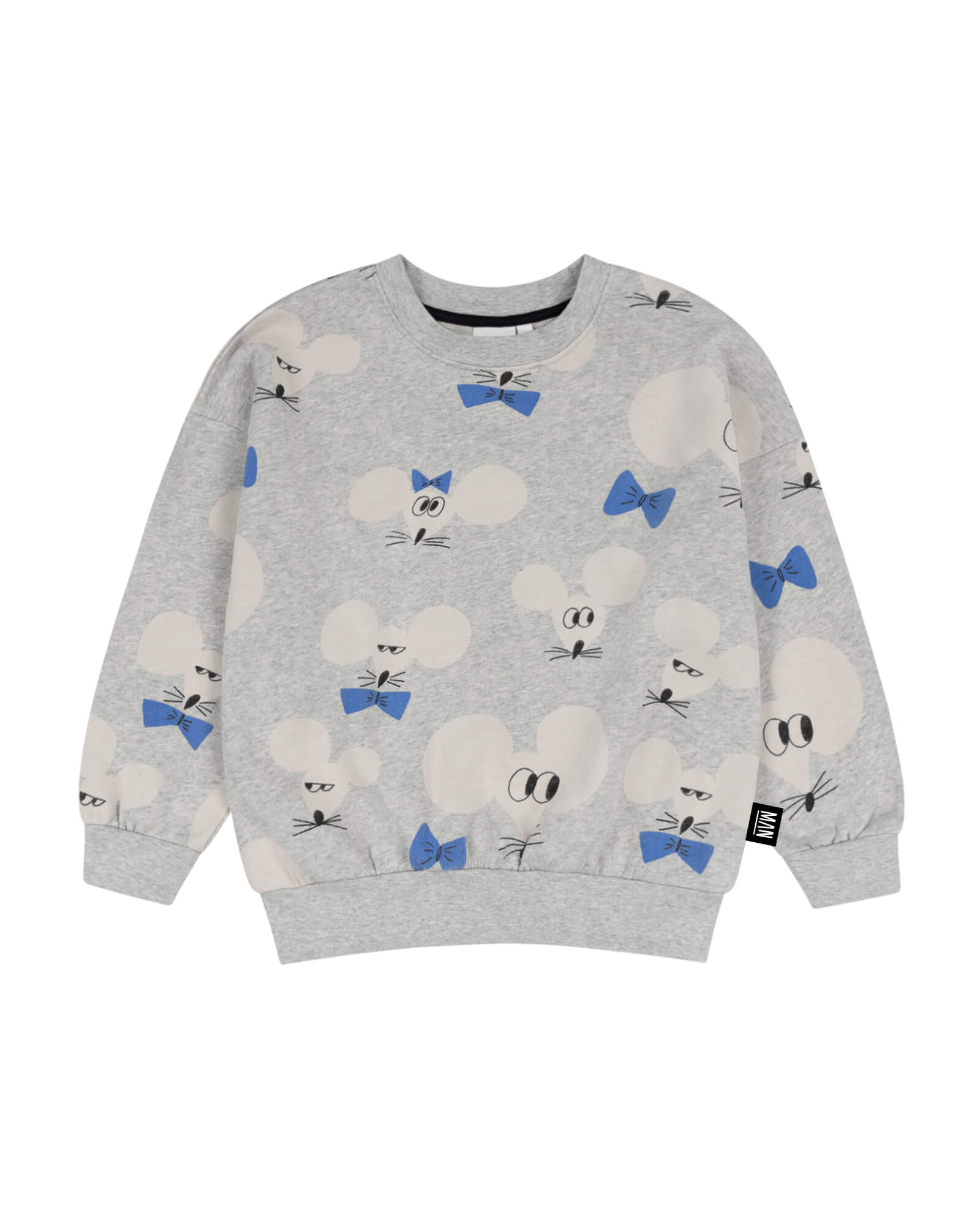 Grey melange kids sweater crafted from 100% organic cotton American fleece with an all-over mouse print. Soft loopback interior, structured outside and bold graphic presence for everyday standout comfort.