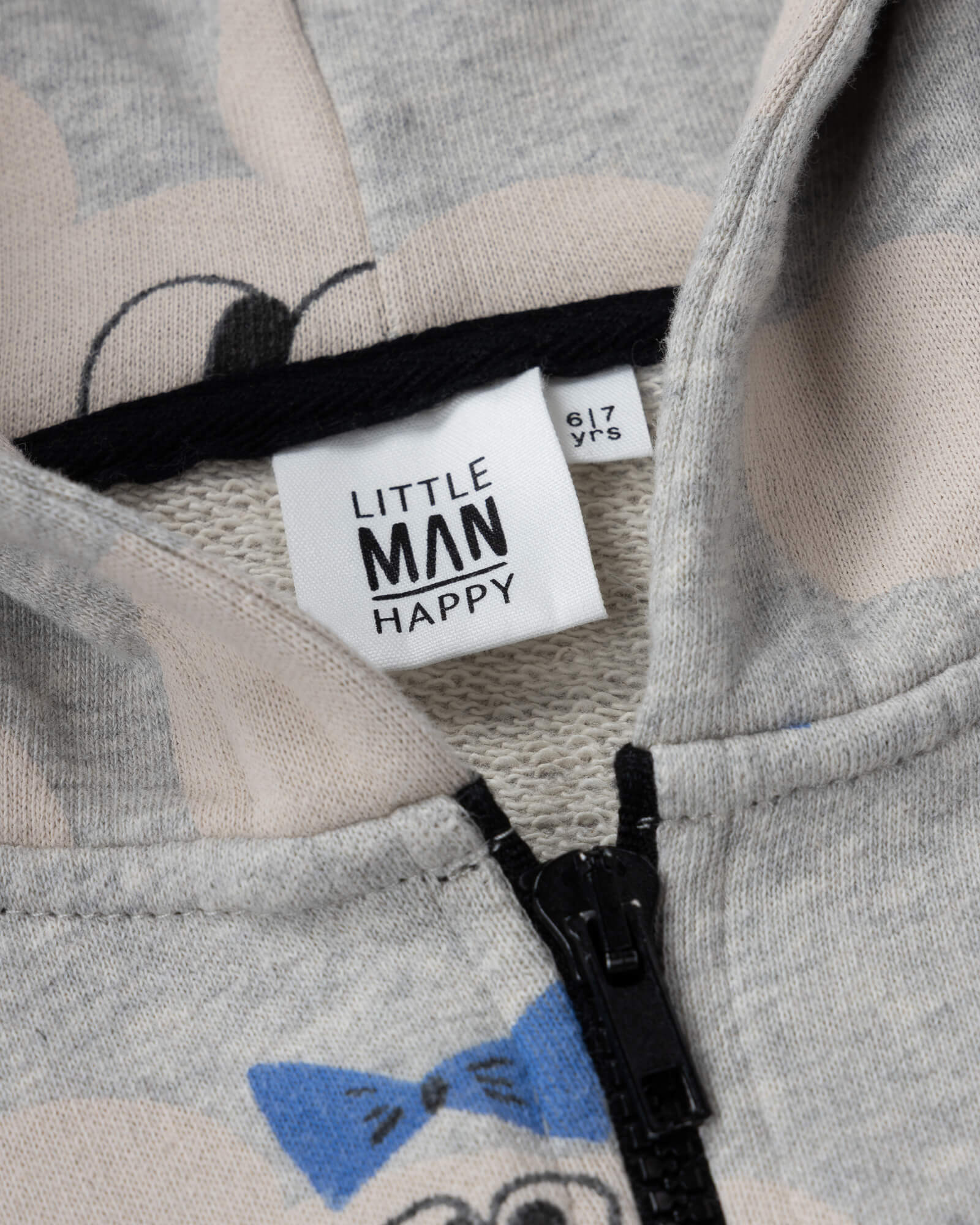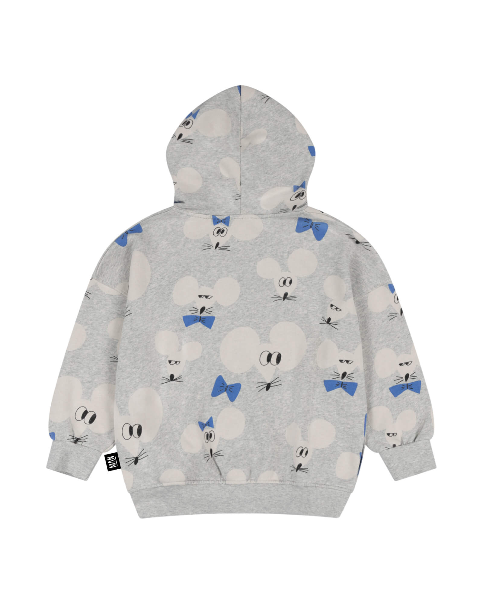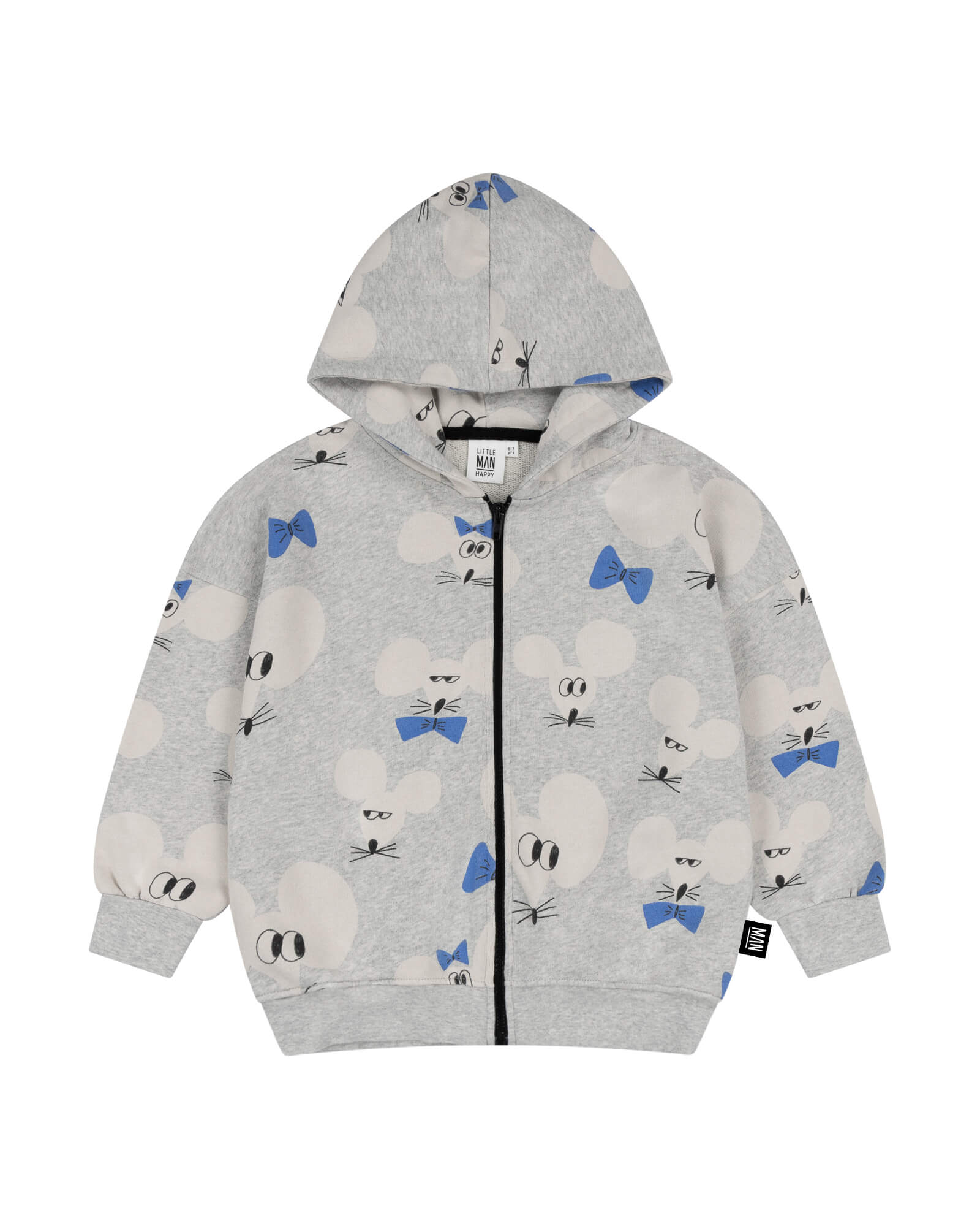 Grey melange hoodie jacket crafted from organic cotton American fleece with bold all-over mouse print. A playful yet urban layering piece designed for comfort, warmth, and everyday street attitude.