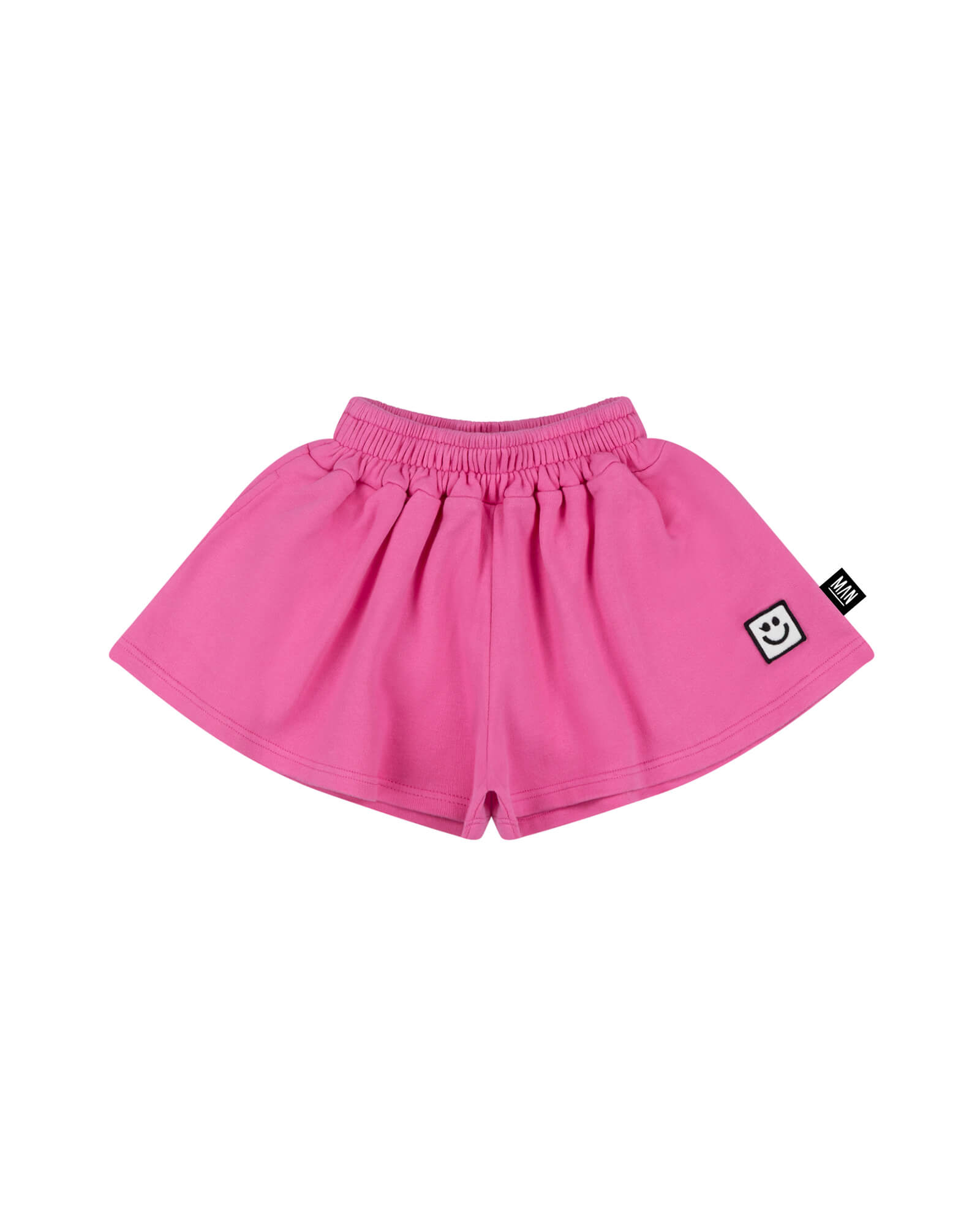 Pink wide leg kids shorts in 100% organic cotton American fleece with relaxed flowing silhouette and subtle LMH smiley patch. The soft loopback interior ensures breathable everyday comfort, while the elastic waistband provides an easy, flexible fit for confident summer movement.