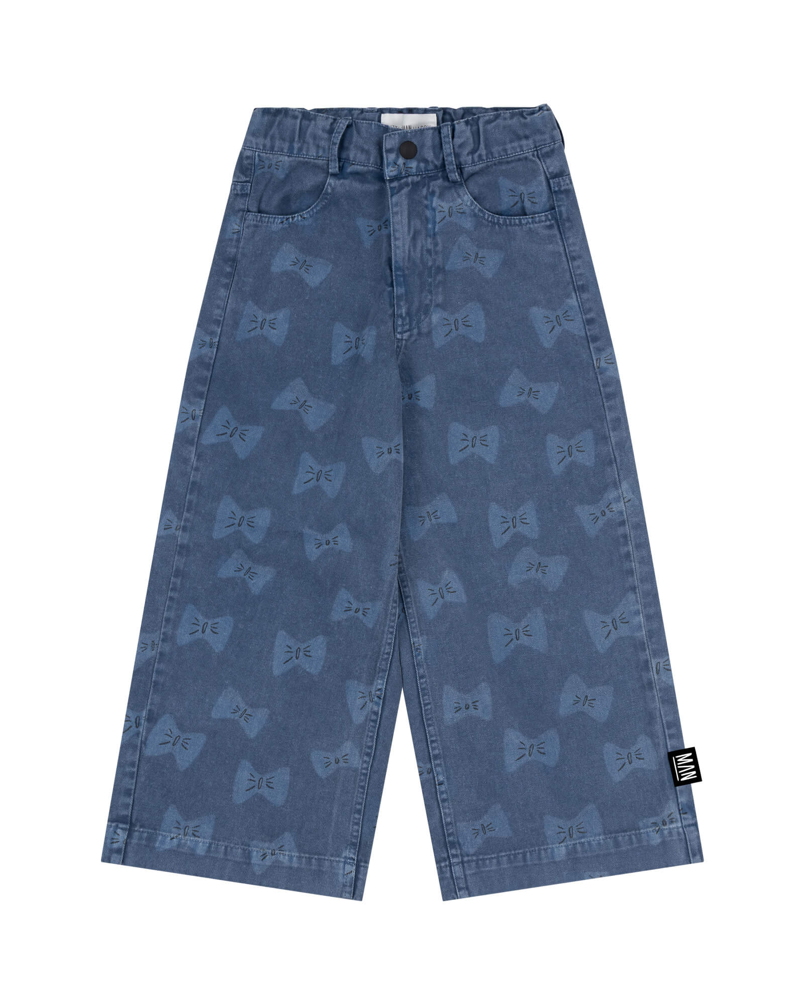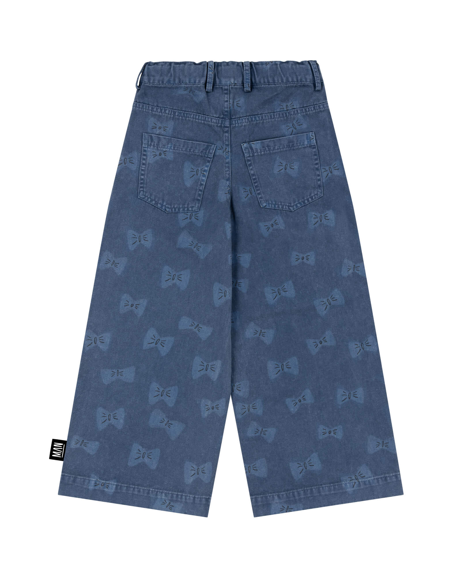 Washed blue kids pants in structured organic cotton twill with wide leg silhouette, heavy wash finish and subtle all-over BOW-MAZING print.