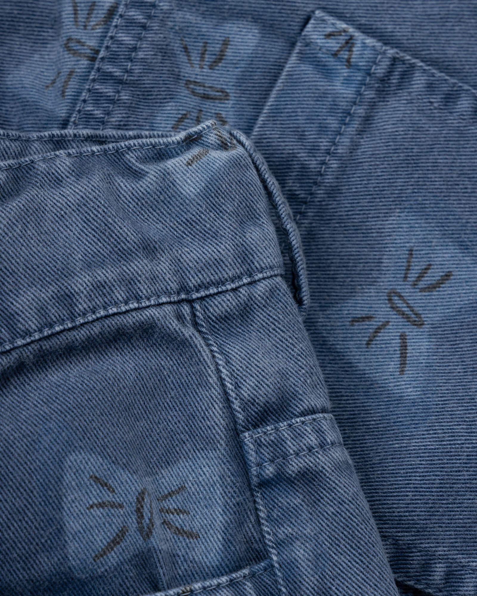 The BOW-MAZING Wide Leg Pants bring together classic workwear structure and playful graphic detail. Crafted from 100% organic cotton woven twill, these washed blue kids pants feature a heavy wash finish that gives the fabric depth, softness and a naturally worn-in character.