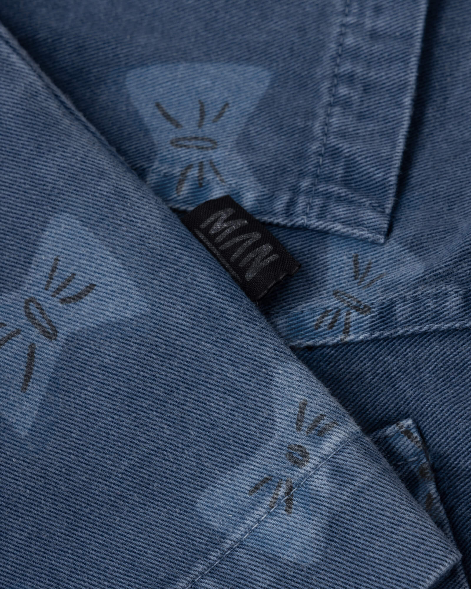 The all-over BOW-MAZING print blends into the washed blue base for a subtle graphic effect. Due to the heavy wash treatment, color and print may appear slightly faded or uniquely softened — making each piece feel individual and authentically lived-in.
