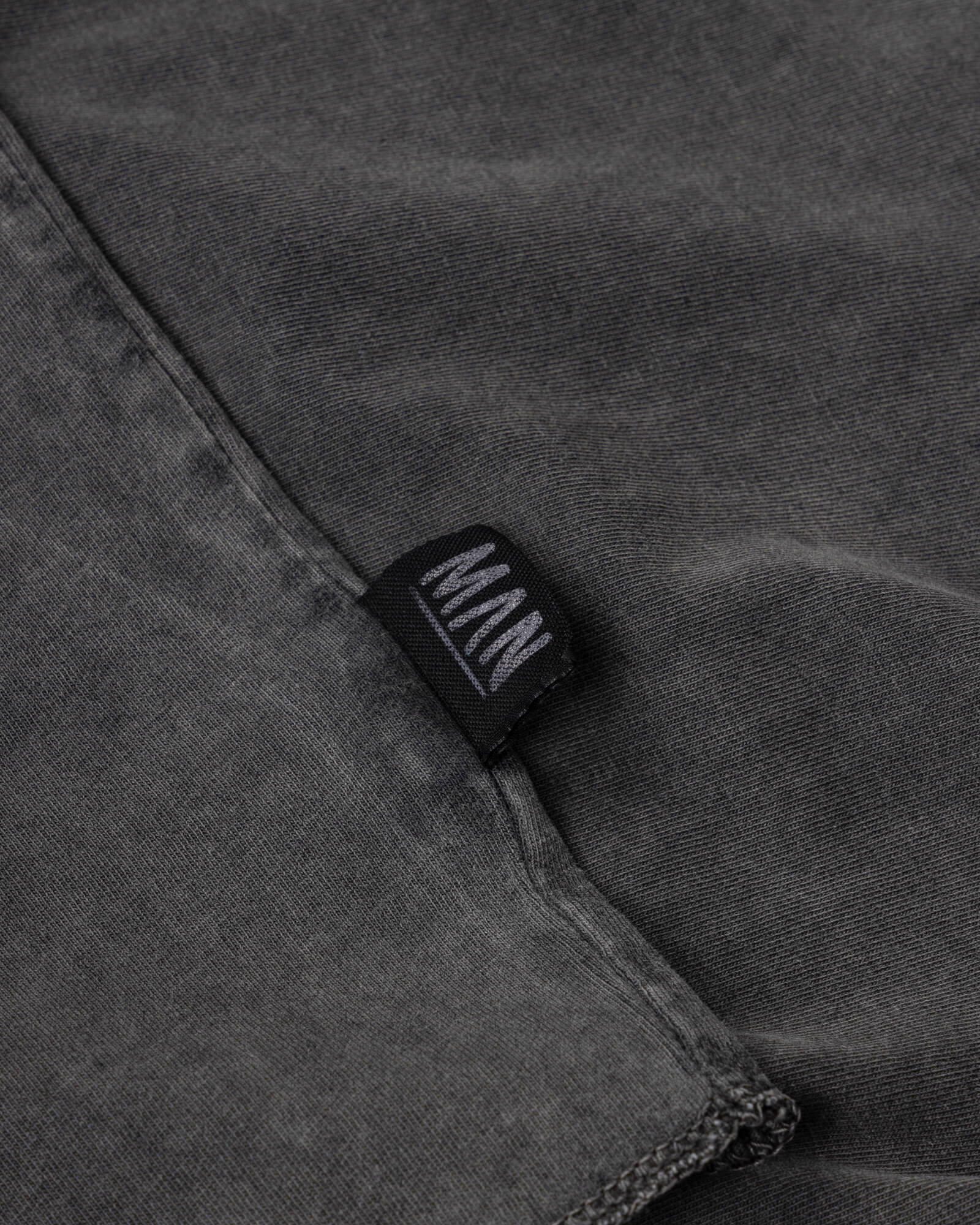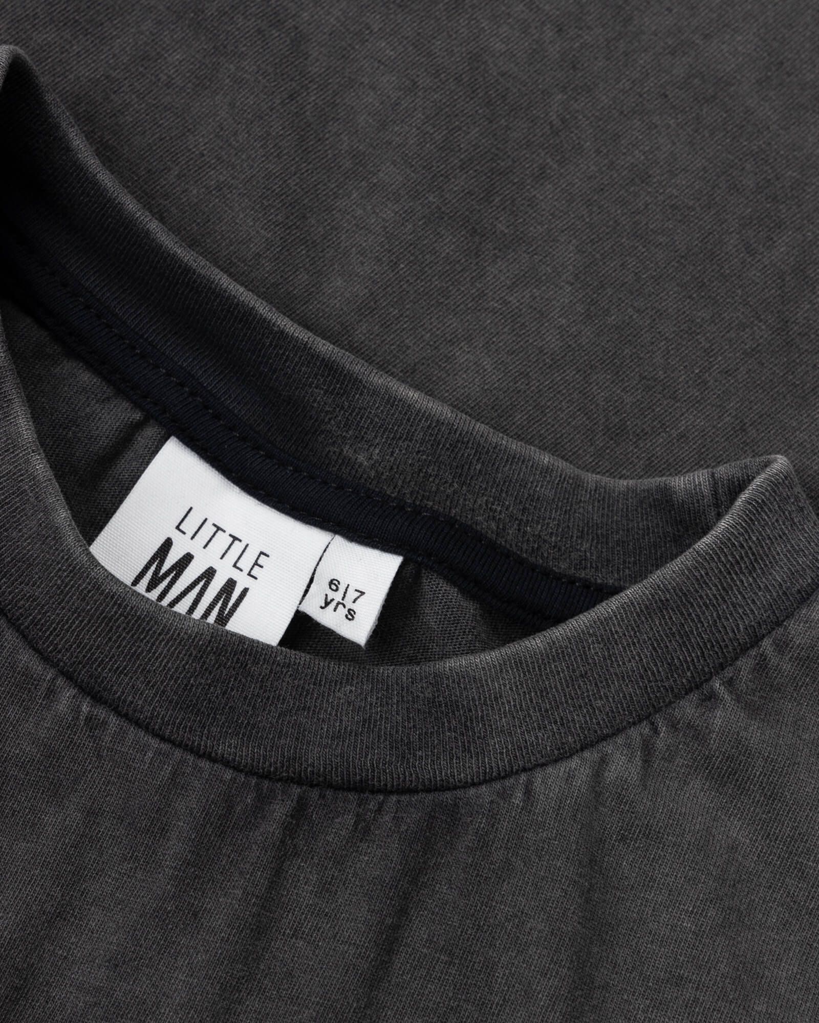 The faded wash gives the fabric a slightly vintage character, adding depth to the minimalist design. A small embroidered LMH smiley face patch at the chest introduces a playful detail without overpowering the look.